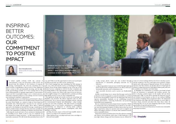 In today ’ s rapidly evolving world , the concept of environmental , social and governance ( ESG ) factors has moved from the sidelines to the forefront of corporate strategy . Unfortunately , the term has somewhat lost its appeal recently . Contributing to this are lack of clear definitions when it comes to ESG and sustainable investing , and the highprofile greenwashing scandals we ’ ve been reading about in the news . Embracing ESG as a genuine opportunity to create positive impact and drive meaningful change is not a common practice , with many companies using it as a ‘ box-ticking ’ exercise to merely meet minimum compliance requirements . The SimplyBiz purpose is to help finance professionals to shape a better financial future , and we see our ESG strategy , shared across the entire Fintel family , as a catalyst to help us create long-term sustainable value , delivering better outcomes for our customers , the market , our people and the planet . We ’ ve taken a tailored approach to developing our internal ESG strategy , considering our impacts , market trends , strategic direction and , most crucially , the views of our stakeholders , including our Member and Client firms . Reflecting the needs and views of our customers is fundamental in everything we do , which is why in 2021 we conducted our first assessment of impact priorities – in ESG jargon known as a materiality assessment . We will refresh this assessment later in the year , and I ’ d like to use this opportunity to invite you to participate and help us prioritise our efforts in the coming years . We ’ ve been keeping busy since launching our ESG strategy in early 2022 , with achievements such as co-founding the Mortgage Climate Action Group , being recognised as one of the top 20 best financial services companies to work for by Best Companies and becoming finalists of the ‘ ESG Initiative of the Year ’ award at the ICA awards , to name a few . What I really want to focus on , however , is the tangible changes we ’ ve implemented to continue providing high-quality services to you , in a more sustainable way . One significant change we ’ ve made is in the way we package and distribute your favourite The Adviser magazines ( and our other publications ). We ’ ve removed plastic packaging entirely , reducing our environmental footprint and eliminating c . 20kg of plastic waste per year from circulation . This shift towards eco-friendly packaging is part of our broader commitment to sustainability , demonstrating our dedication to reducing plastic pollution and promoting responsible resource consumption , with other highlights including :