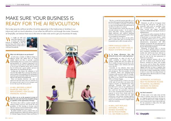 Fundamentally no , what AI will do is enable scalability to human tasks . For example , scaling IFAs does not replace the IFA , it enables an improved outcome to the customer whilst a more efficient and lower cost to the IFA . Currently , in our industry , what many refer to as AI is really just machine learning and automation . The most popular AI tool is ChatGPT which uses language-based learning to fully automate tasks , for example , writing a letter . However , there is yet to be the ability to use ChatGPT from Intelligent Office or Defaqto Engage . A good measurement to look at in terms of the value AI can offer is in terms of the required amount of administration firms undertake . Typically , firms today will generally need a ratio of one administrator to three advisers . If AI is fully embraced , this could have the potential to become one to nine , meaning firms would have the capacity to service more clients and more households . Firms would need the right architecture and systems working together to make this a reality . It ’ s a phased approach and we are well positioned to support firms with this transition .
