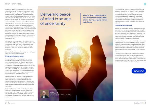 In times like these, advisers earn client trust by remaining a calm, reassuring presence for clients bombarded by market noise. According to the lang cat’ s 2025 Advice Gap research, a third of those who paid for financial advice in the last two years did so because it gave them peace of mind that they would have enough money in future. Periods of market turbulence are the perfect time to emphasise that investors should always focus on the long term in seeking future financial security and not react in panic to every market movement.