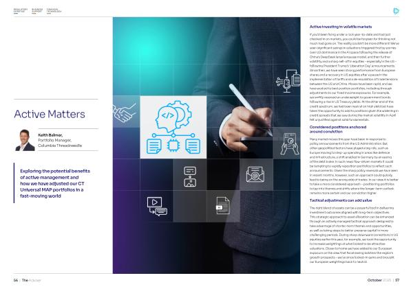 If you’ d been living under a rock year-to-date and had just checked in on markets, you could be forgiven for thinking not much had gone on. The reality couldn’ t be more different! We’ ve seen significant swings in valuations triggered first by worries over US dominance in the AI space following the release of China’ s DeepSeek large language model, and then further volatility and a sharp sell-off in equities – especially in the US – following President Trump’ s‘ Liberation Day’ announcements. Since then, we have seen strong performance from European shares and a recovery in US equities after a pause in the implementation of tariffs and a de-escalation of trade tensions between the US and China. Moves have been rapid, and we have worked to best position portfolios, including through adjustments to our fixed income exposures. For example, we swiftly reversed an underweight to government bonds following a rise in US Treasury yields. At the other end of the credit spectrum, we had been neutral on high yield but have taken the opportunity to add to positions given the widening in credit spreads that we saw during the market volatility in April felt unjustified against solid fundamentals.